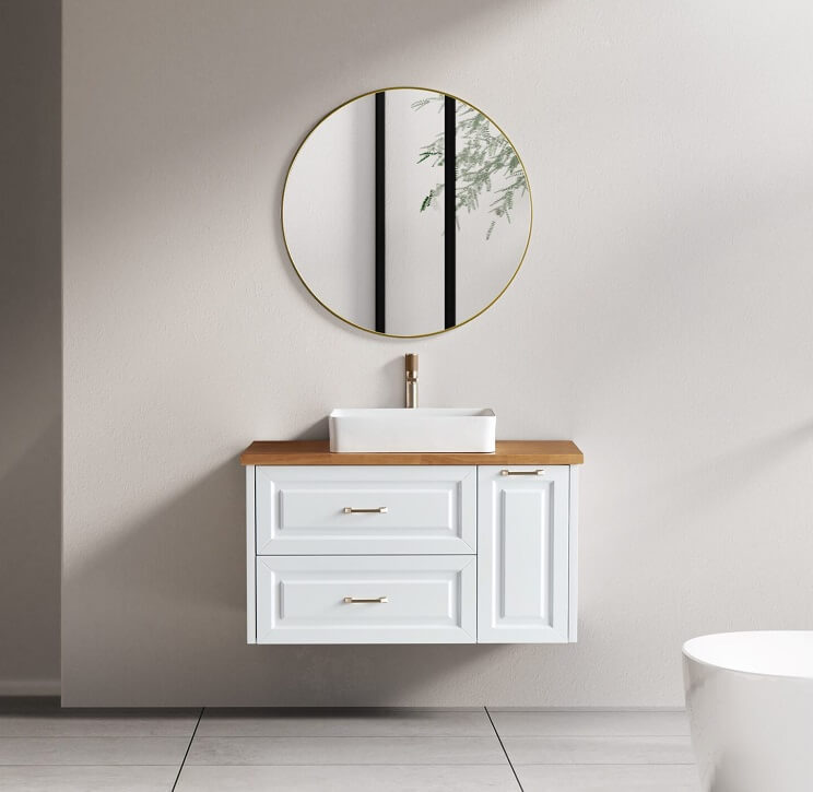 בוצ'ר עץ וכיור מונח לבן מבריק תואם לבחירה (ניתן לשדרוג).