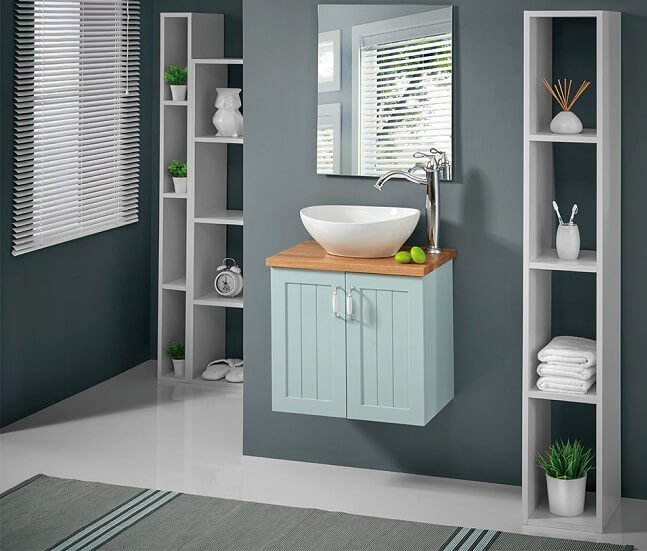 ארון אמבטיה תלוי דגם טוקיו עם משטח בוצ'ר עץ וכיור מונח.