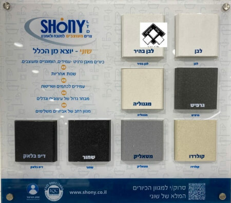 מגוון צבעים לבחירה (ראה דוגמאות) : שחור, לבן, בהיר, אפור, קולורדו, מטאליק, גרפיט, דיפ-בלאק, מגנוליה.