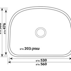 מידות: רוחב 56 ס"מ, עומק 50.6 ס"מ, גובה 20.3 ס"מ. פרטים נוספים בשרטוט. כיורים למטבח המתאימים לארון (פנימי) מינימלי: 55 ס"מ. עומק משטח (חיצוני) מינימלי: 60 ס"מ. מתאים להתקנה שטוחה / תחתונה.