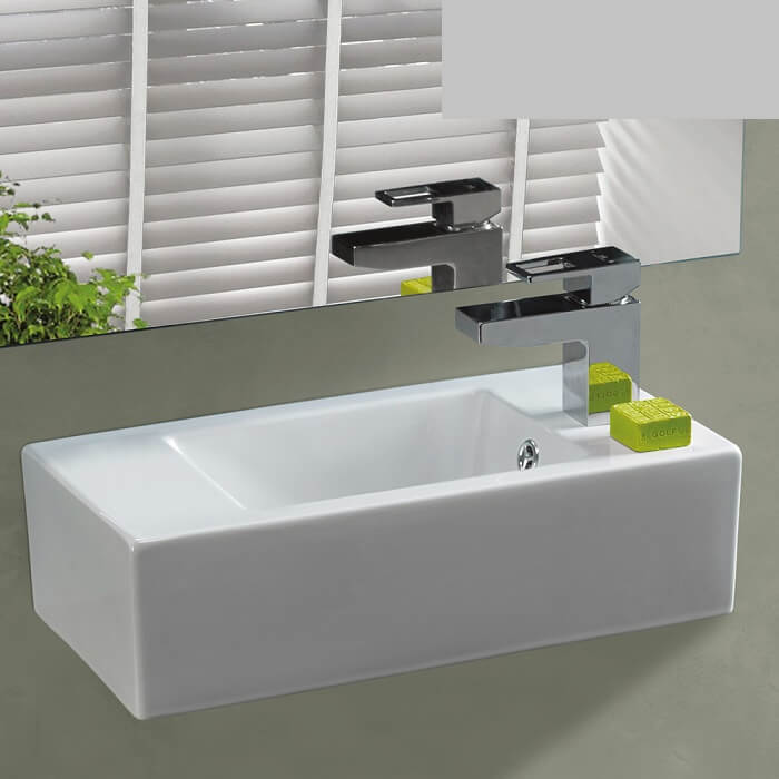 כיור חרס צר לחדר רחצה היכול לשמש ככיור תלוי לקיר וגם ככיור מונח למשטח.